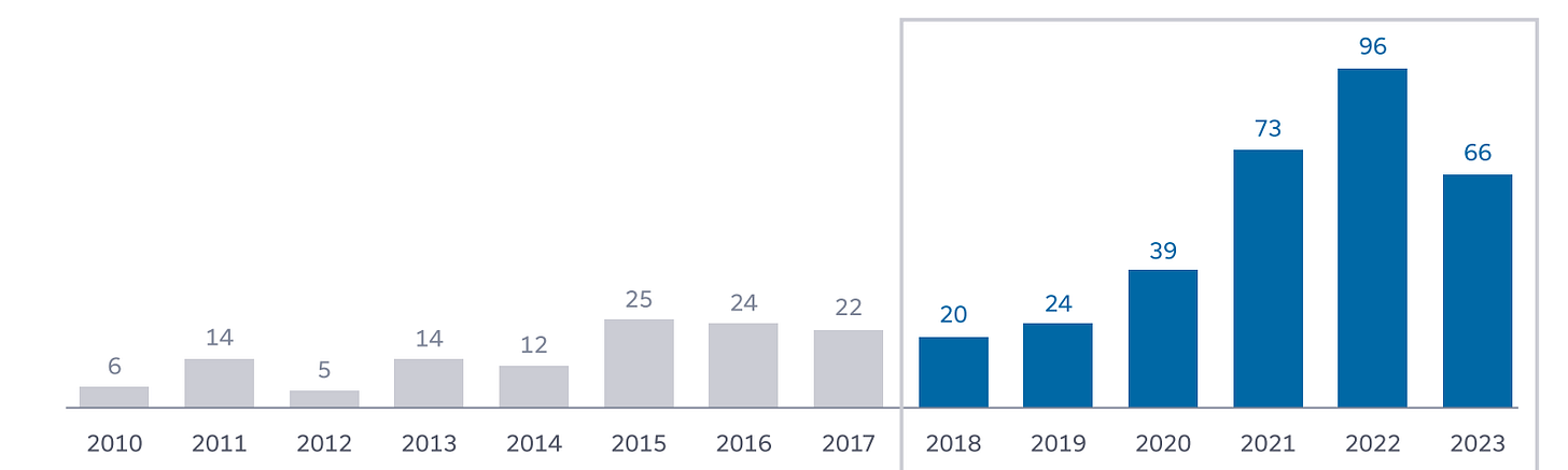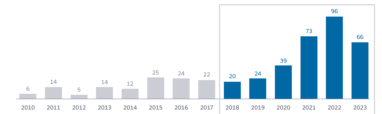 M&A activity peaked in 2022, riding the momentum of the COVID boom years in 2020 and 2021. There were 96 transactions in 2022. In 2023, that number dropped sharply to 66. For comparison, between 2015 and 2019, annual M&A activity typically ranged from 20 to 25 transactions.